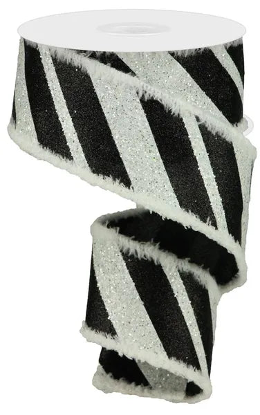 2.5inx10yd Giant Diagonal Lines/Drift Black and Silver Christmas