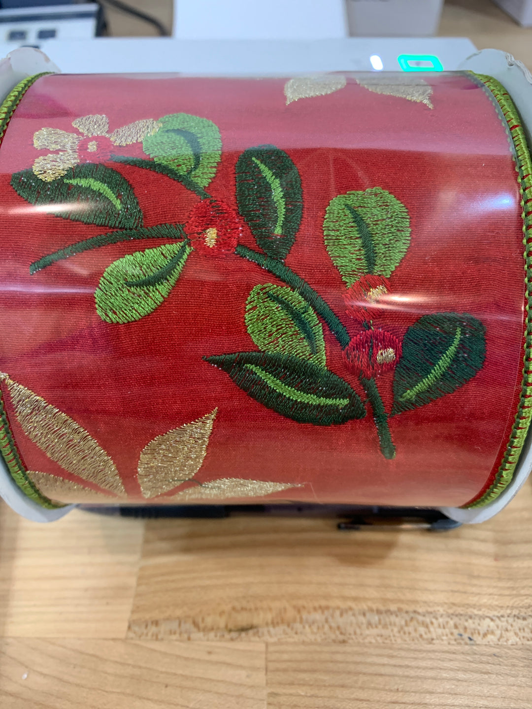 4inx10yd Embroidery Red/Green/Gold Leaf Pattern Berry Ribbon