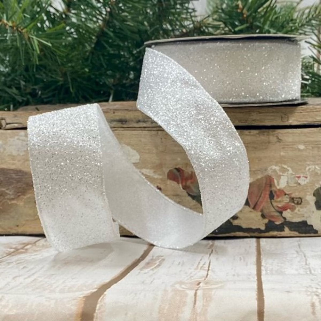 1.5inx10yd DStevens Satin Frosted Glitter Christmas Ribbon in White
