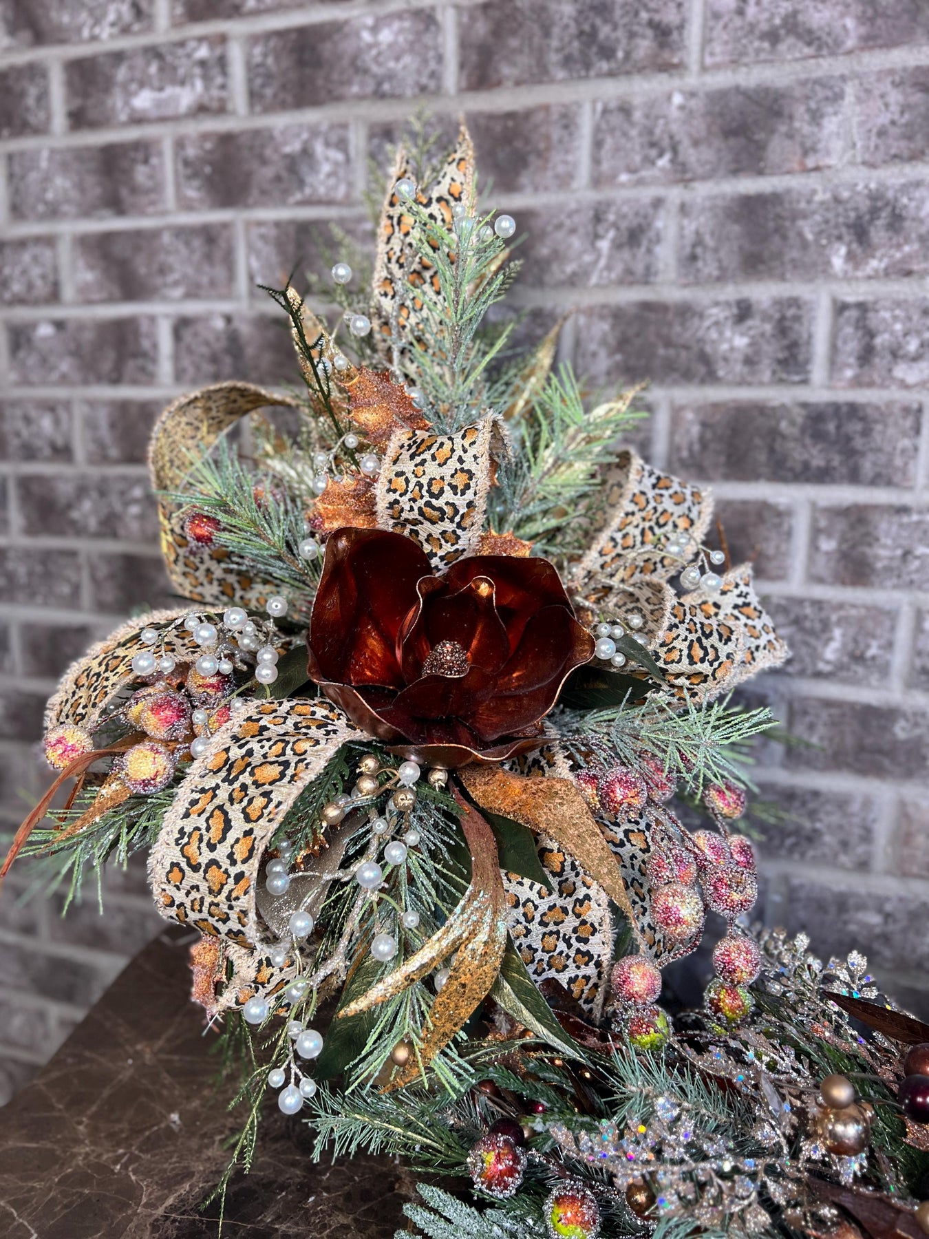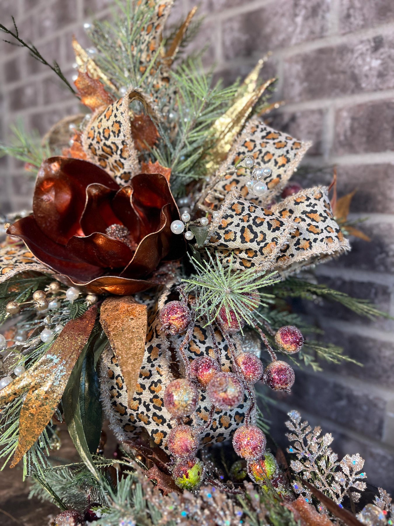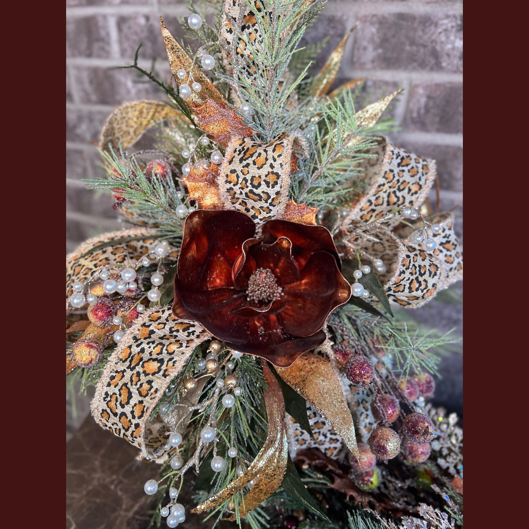 Add a touch of glam to your holiday décor with this stunning Christmas centerpiece featuring a bold bronze magnolia bloom surrounded by sparkling bronze accents, frosted pine greenery, pearl sprays, and glittered berries. The leopard print ribbon adds a chic, unexpected twist—perfect for those who love a mix of elegance and personality in their seasonal décor.