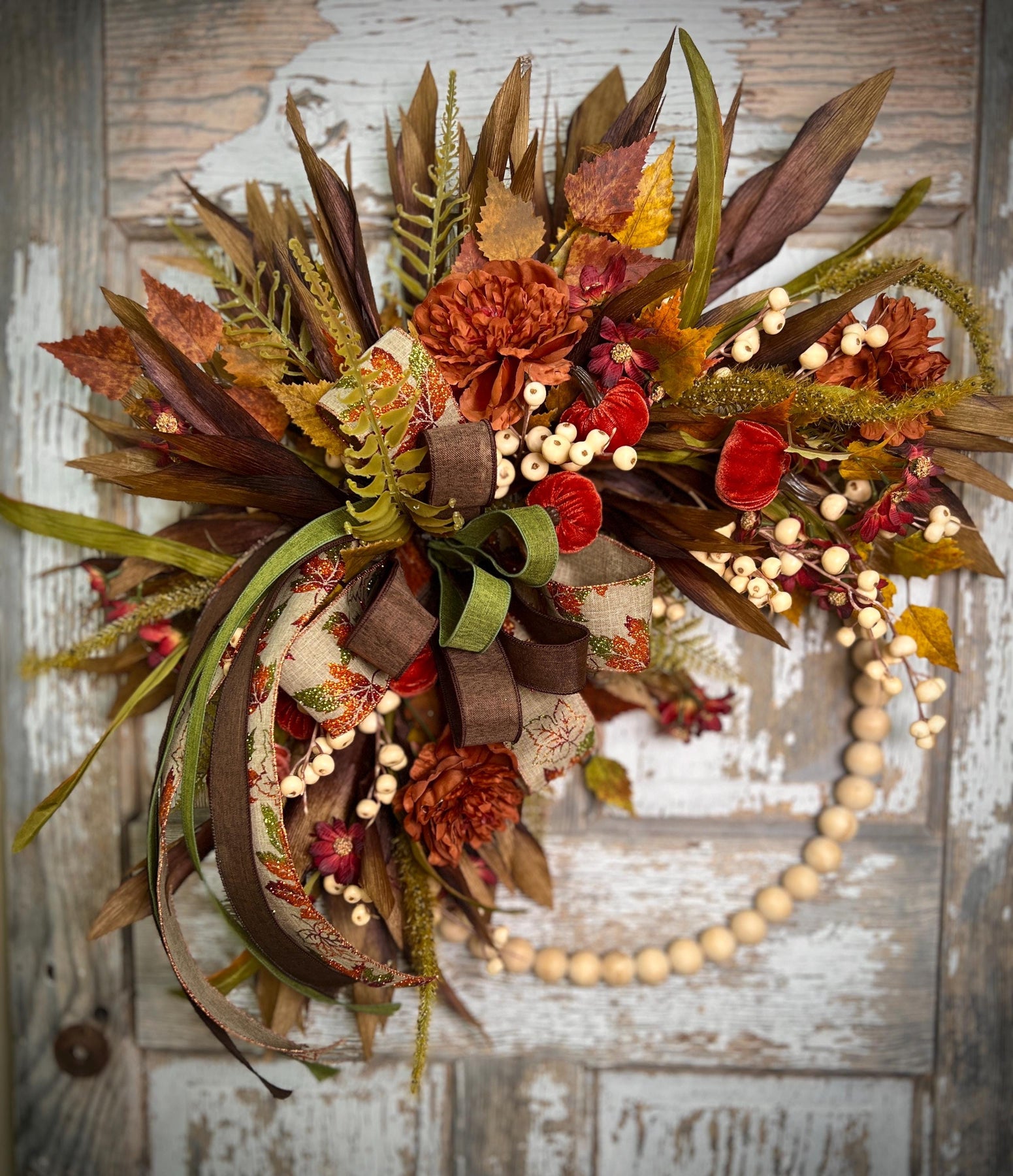 Fall Bead Wreath with Fall Florals and Pumpkins