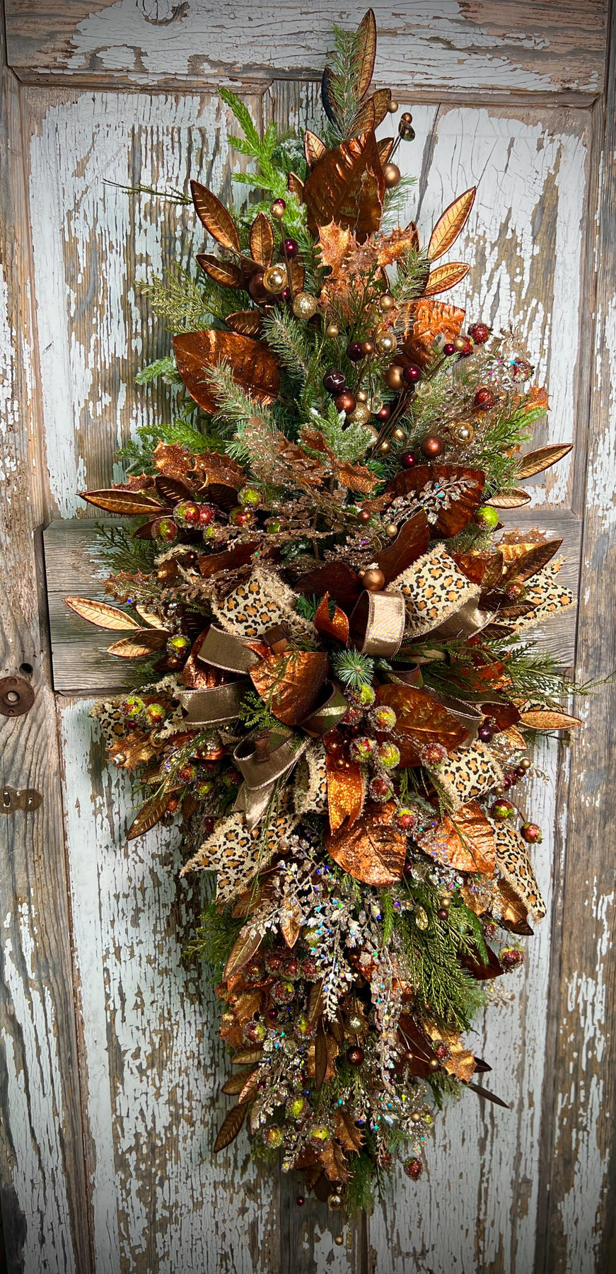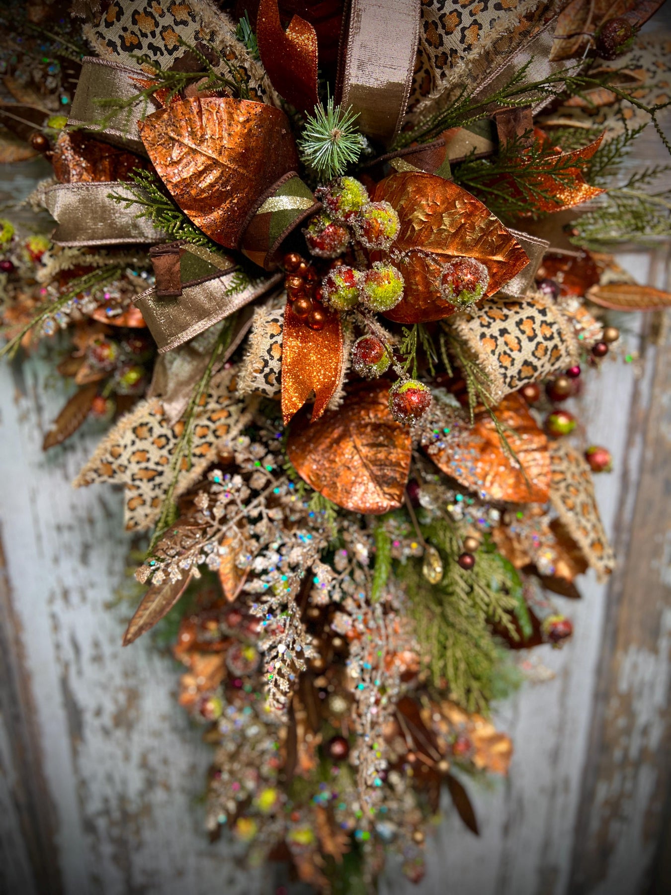 Bring bold elegance into your seasonal décor with this handcrafted Fall Swag. Designed with using two teardrop evergreen swags that are connected together. Made with shimmering bronze leaves, frosted greenery, glittered accents, and luxe wired ribbon in metallic gold and leopard print, this arrangement makes a statement whether styled on your front door, entryway wall, or as a dramatic centerpiece on your dining table.