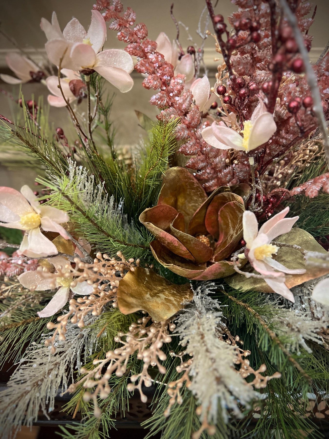 At the heart of the design are designer magnolia blooms, showcased in soft blush tones with petal edges dusted in a delicate frosted shimmer. These magnolias provide a graceful, romantic touch while pairing beautifully with the deep winter greenery. Tucked among them are full, multi-toned magnolia leaves with warm golden and burgundy undertones—creating rich depth and drawing the eye inward toward the body of the arrangement.