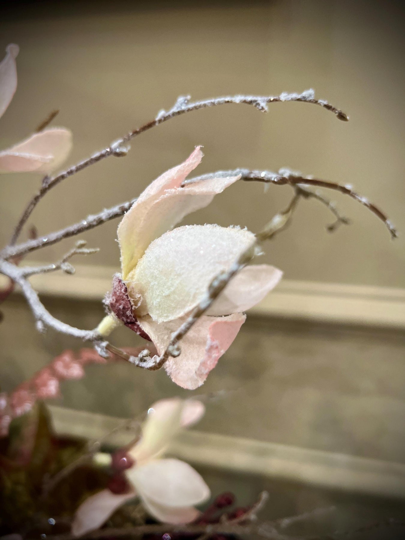Rising throughout the center and sides are clusters of burgundy holiday berries and sparkling iced sprays, adding vertical movement and glistening dimension. These shimmering stems catch the light from every angle, making the entire piece glow with quiet luxury. Soft blush beaded fern stems and champagne botanical sprays gently cascade outward, giving the arrangement its signature couture winter aesthetic.