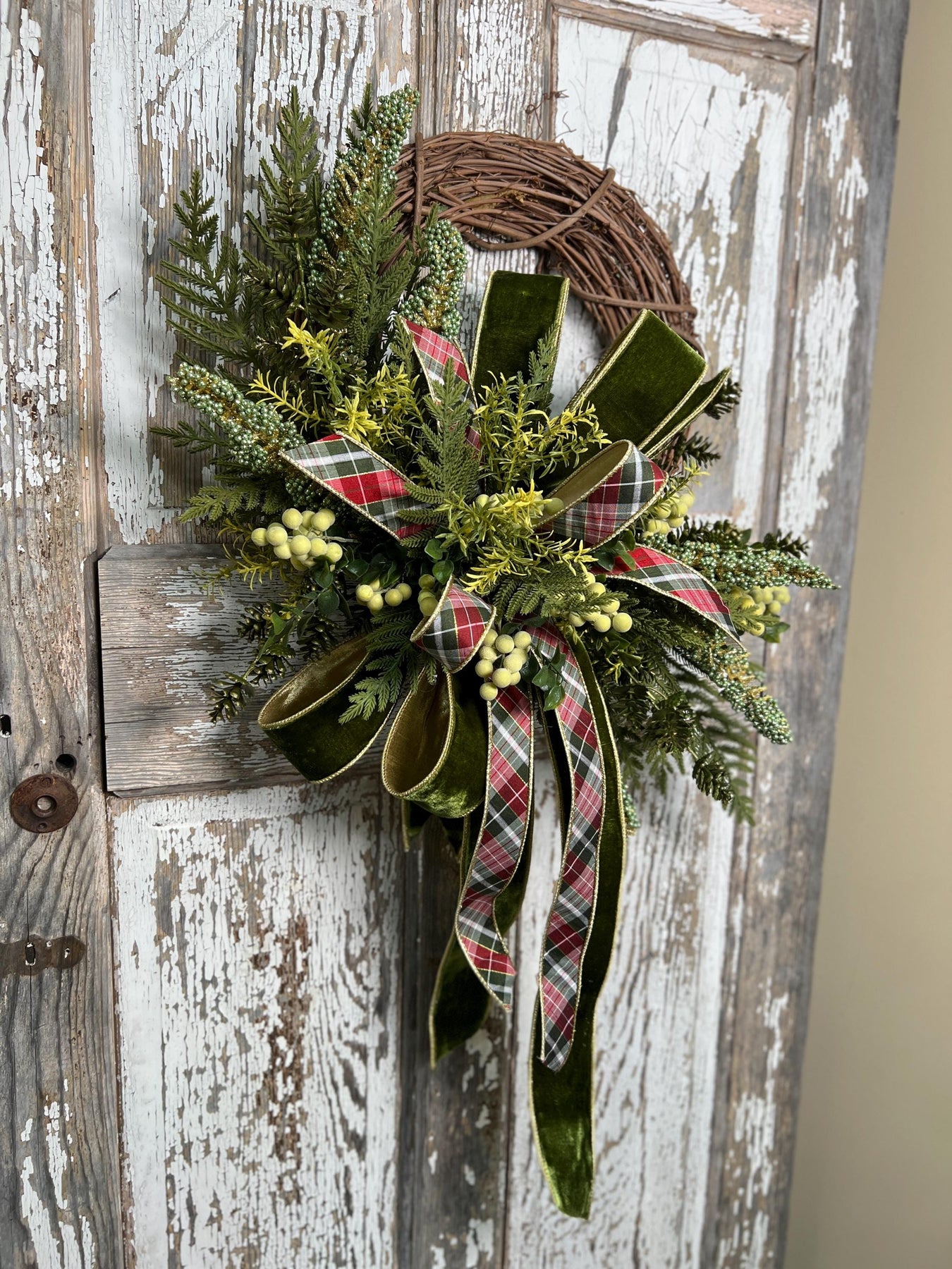 Add rustic charm to your holiday decor with this handcrafted Christmas wreath made from realistic evergreen stems, creamy light green berries, and a showstopping mix of velvet and plaid ribbon. This Christmas and Winter greenery wreath is designed on a grapevine base, creating a natural and timeless look that transitions beautifully from fall through the Christmas season.