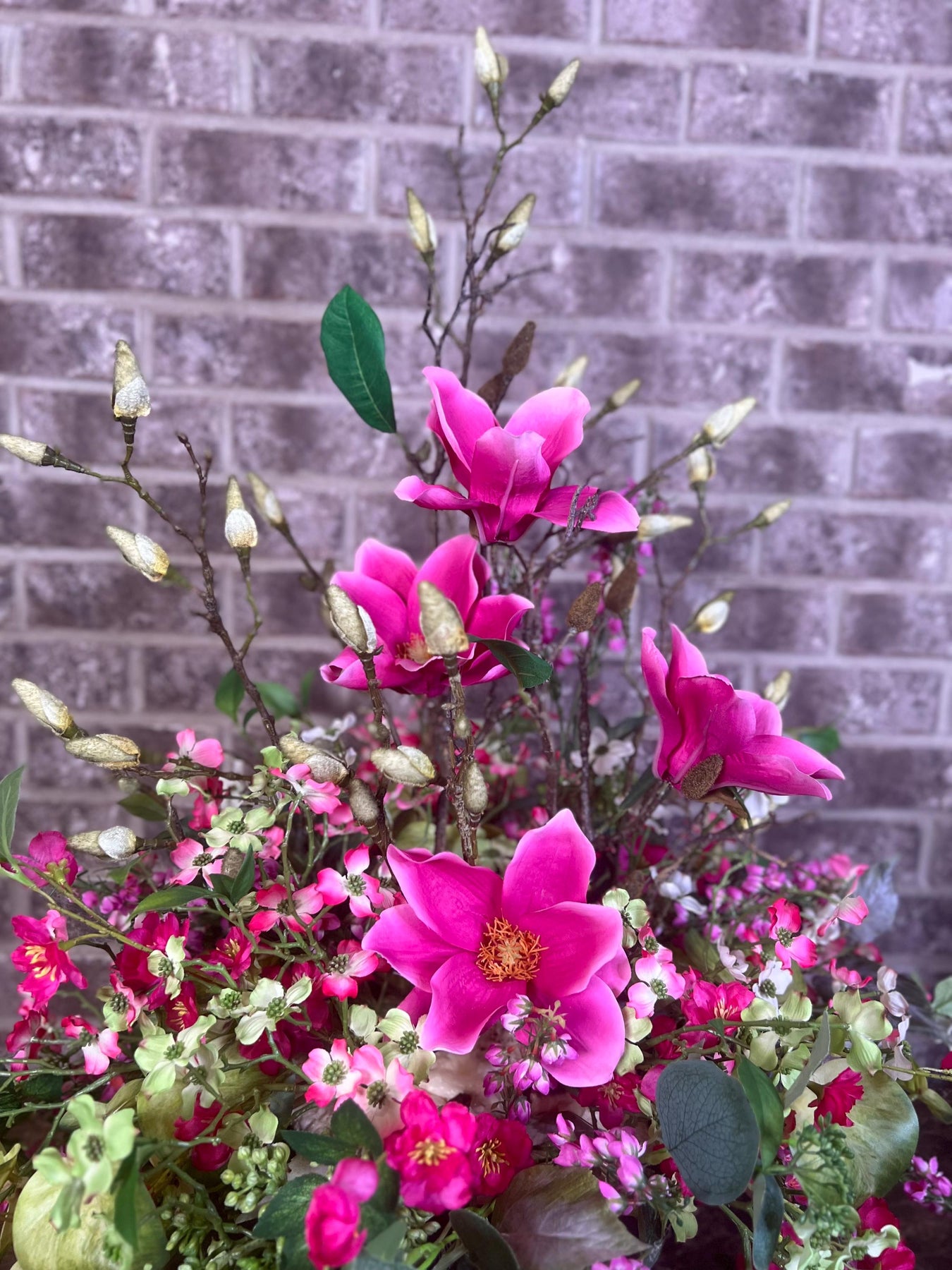 This breathtaking all-season floral arrangement is a true showpiece, overflowing with elegance and natural charm. Designed in a rustic-style dough bowl, it features a dramatic blend of vibrant fuchsia pink magnolias standing tall and graceful among their budding branches, complemented by lush pink peonies that bring fullness and richness to the design. The magnolia buds lend a lifelike sense of new growth and seasonal renewal, creating depth and dimension throughout the arrangement.