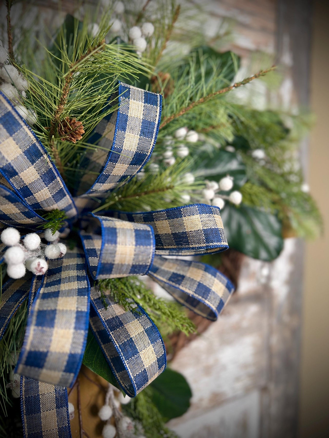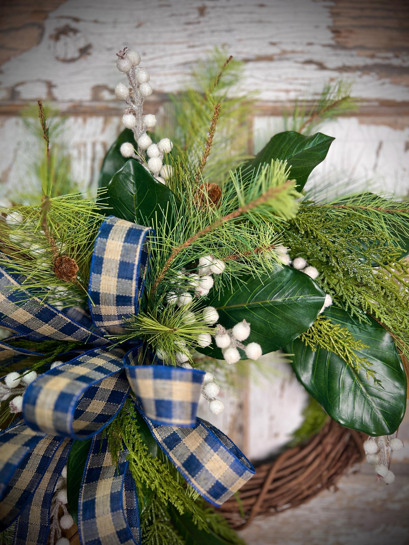 Welcome the cozy charm of winter with this handcrafted evergreen wreath featuring a stunning blend of magnolia leaves, frosted white berries, real-touch pine, and a bold navy and cream plaid bow. Designed on a grapevine base, this asymmetrical wreath is a unique take on traditional holiday decor.