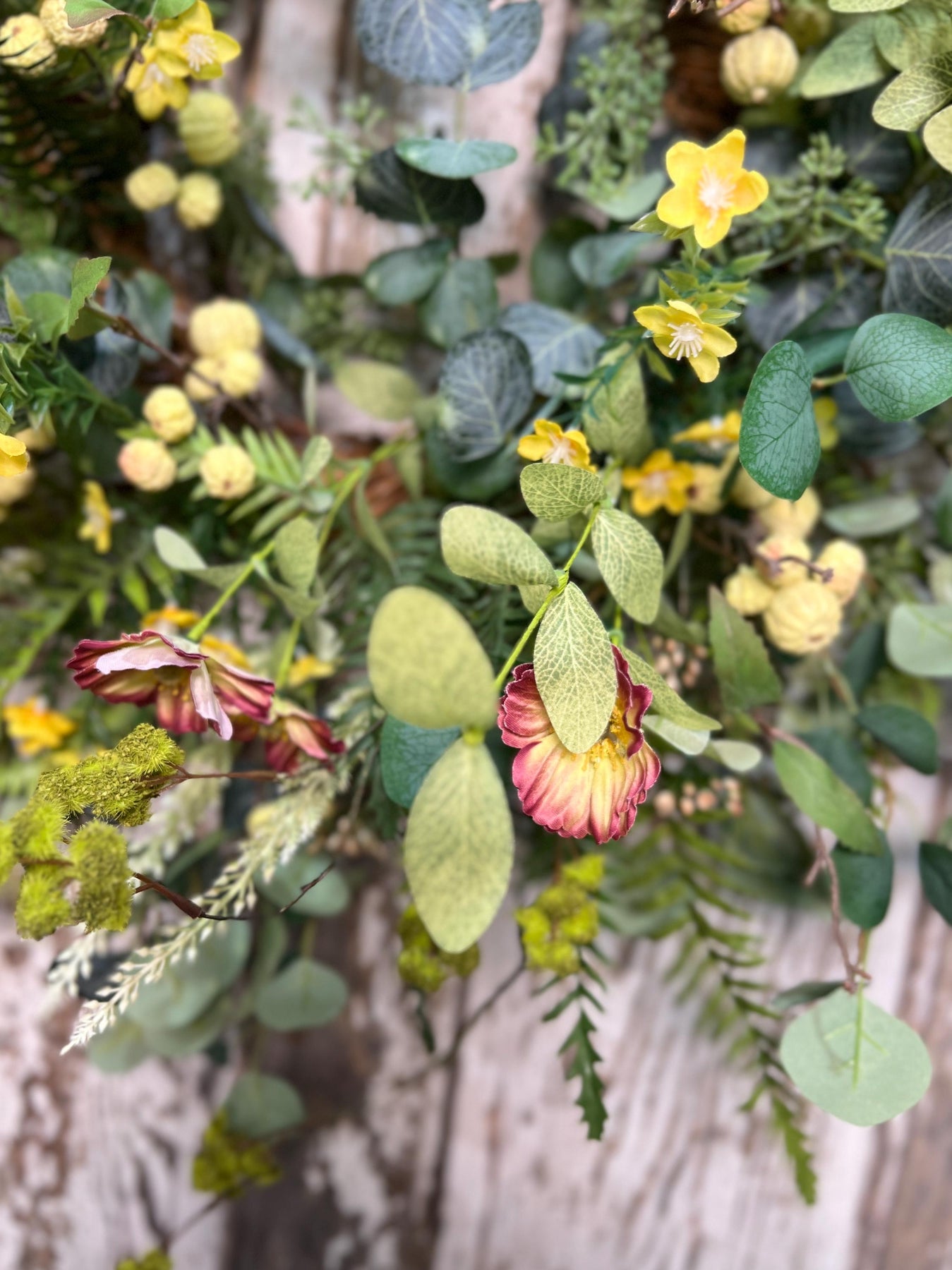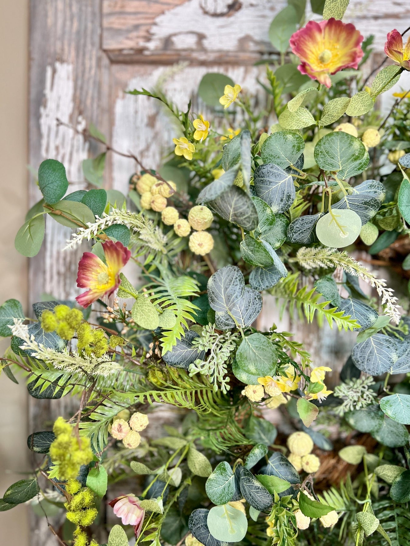 The design is overflowing with layers of realistic spring greenery, including wispy ferns, eucalyptus leaves, soft textured foliage, and delicate trailing elements that add beautiful movement and depth. Cheerful poppy-style blooms in warm tones of golden yellow, blush, and soft coral are artfully placed throughout, creating eye-catching pops of color that feel fresh, organic, and inviting. Clusters of berry accents and budding details are woven in for added texture, giving the wreath a true garden-gathered appearance.