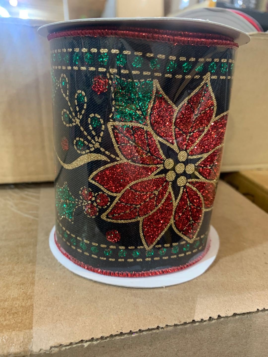 4in Glitter Poinsettias on BLACK ribbon BLBL