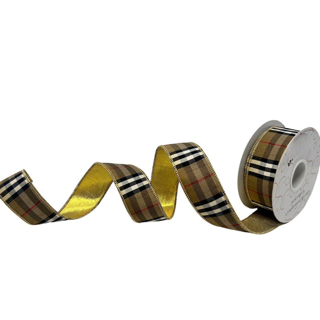 1.5 inch x 10 yards Burberry Check w/Gold Lame Back Christmas Ribbon